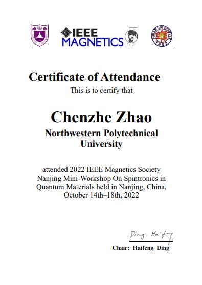 ARTIST课题组成员赵晨哲参加2022 IEEE Magnetics Society Nanjing Mini-Workshop并做题为Reducing the switching time in magnetic tunnel junctions via insertion of rare-earth nanolayers的报告